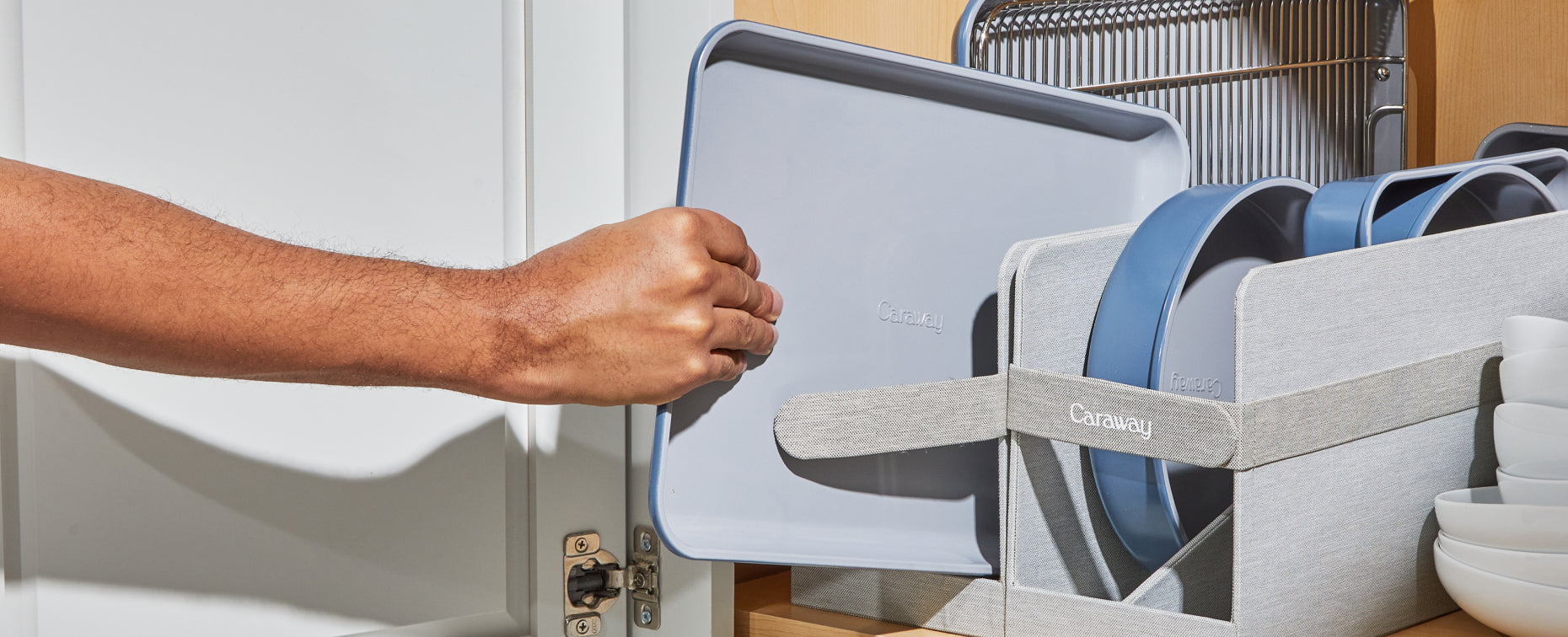 For storing, we recommend utilizing your storage caddies to keep your bakeware in top condition. If stacking, place towels, trivets, or a protective sheath between pan surfaces to minimize direct contact.