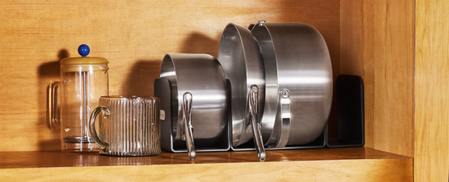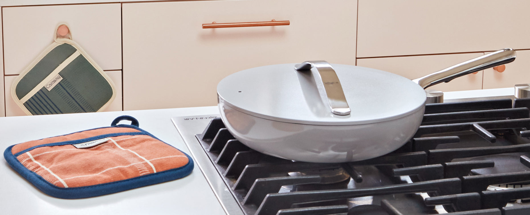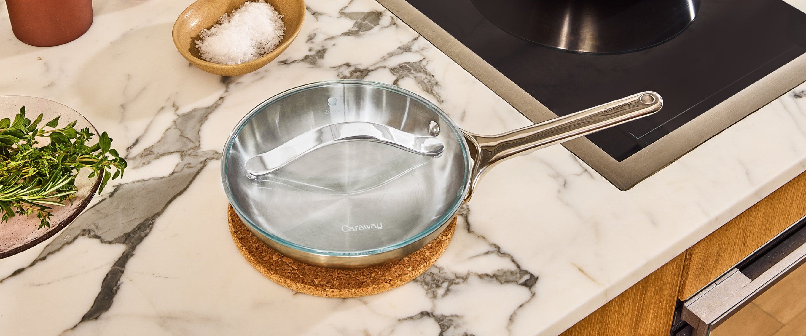 Caraway's 5-ply stainless steel cookware can hold heat more efficiently than traditional pans, so use yours on low to medium heat when cooking. Overheating can cause food to stick to the pan! -